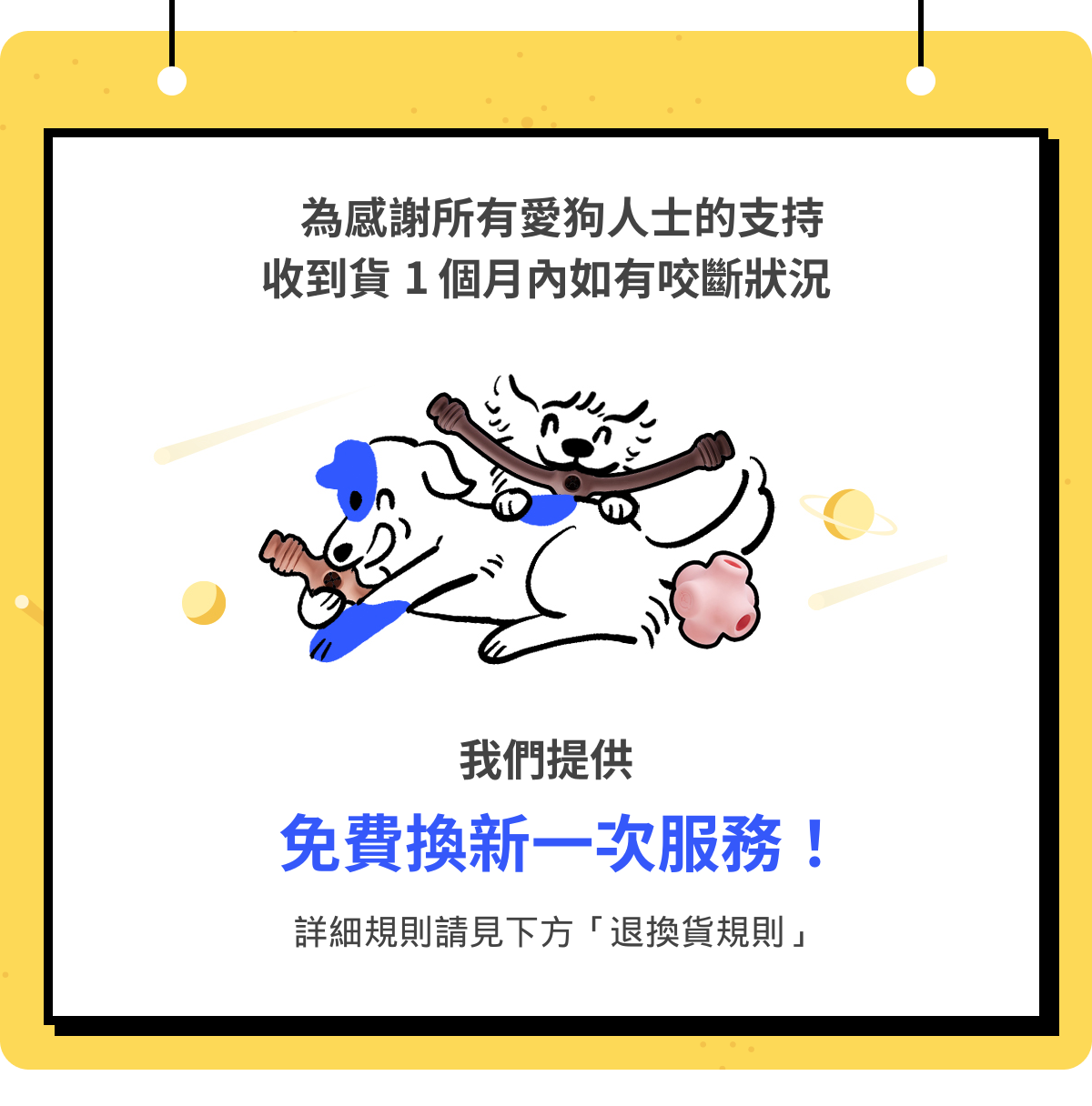 2. 狗狗啃咬以外造成的破損:家中狗狗以外的寵物啃咬或人為造成的破損,不在換新服務範圍