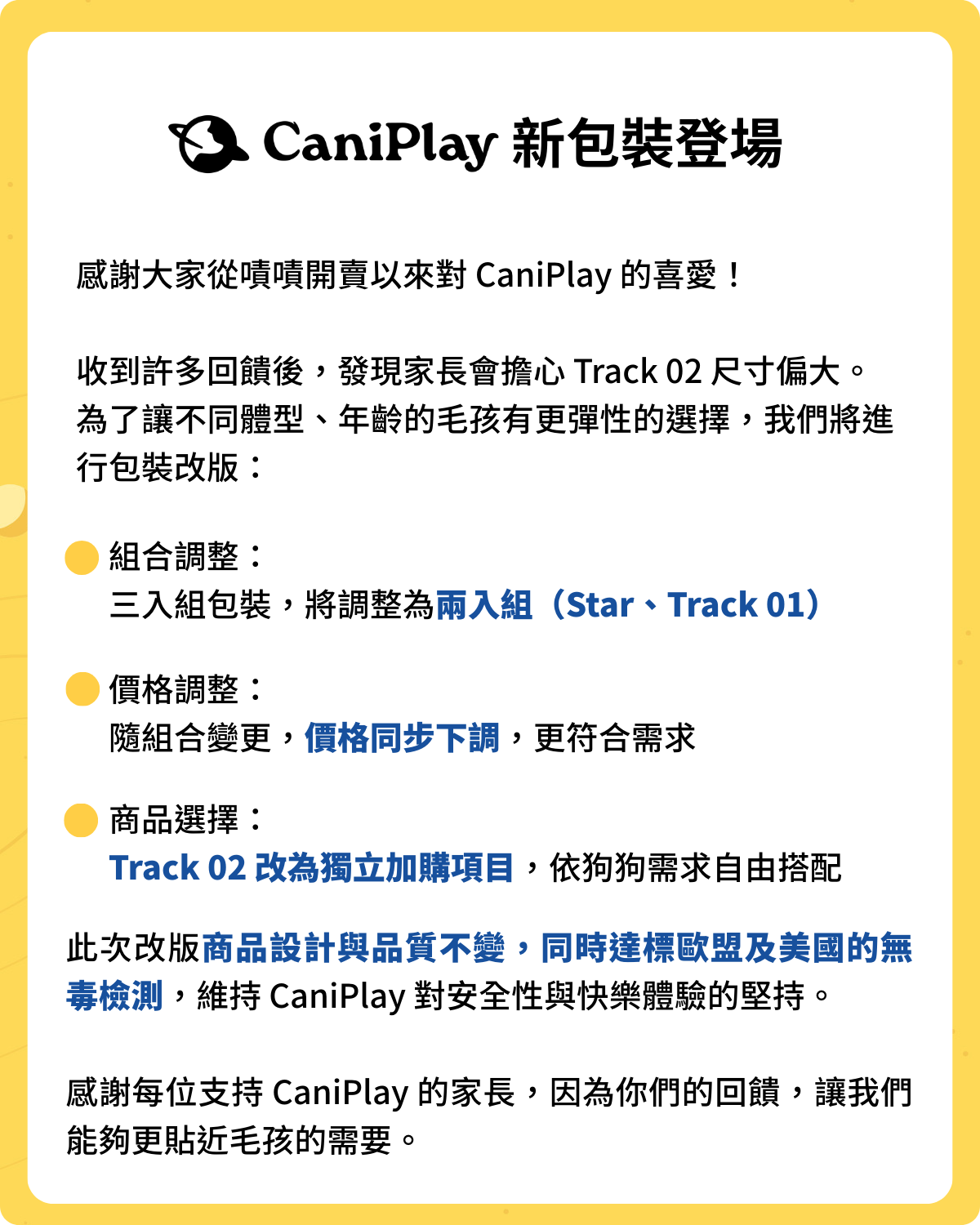 1. CaniPlay 屬於接觸型商品,辦理退貨時,須將包裝完整包妥,必須將商品保持原始狀態(未經使用、清洗)。若經查商品有下列情形者,被認定為已逾越商品鑑賞之必要程度,將會影響退貨權利或須負擔毀壞之費用: